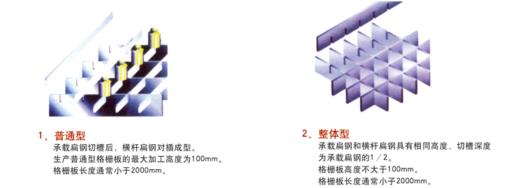 由一定尺寸的普碳扁钢、不锈钢、黄铜板、铝板经开槽(孔)、插接对插、焊接、精整等加工序制造而成。对插格栅板涵概了普通